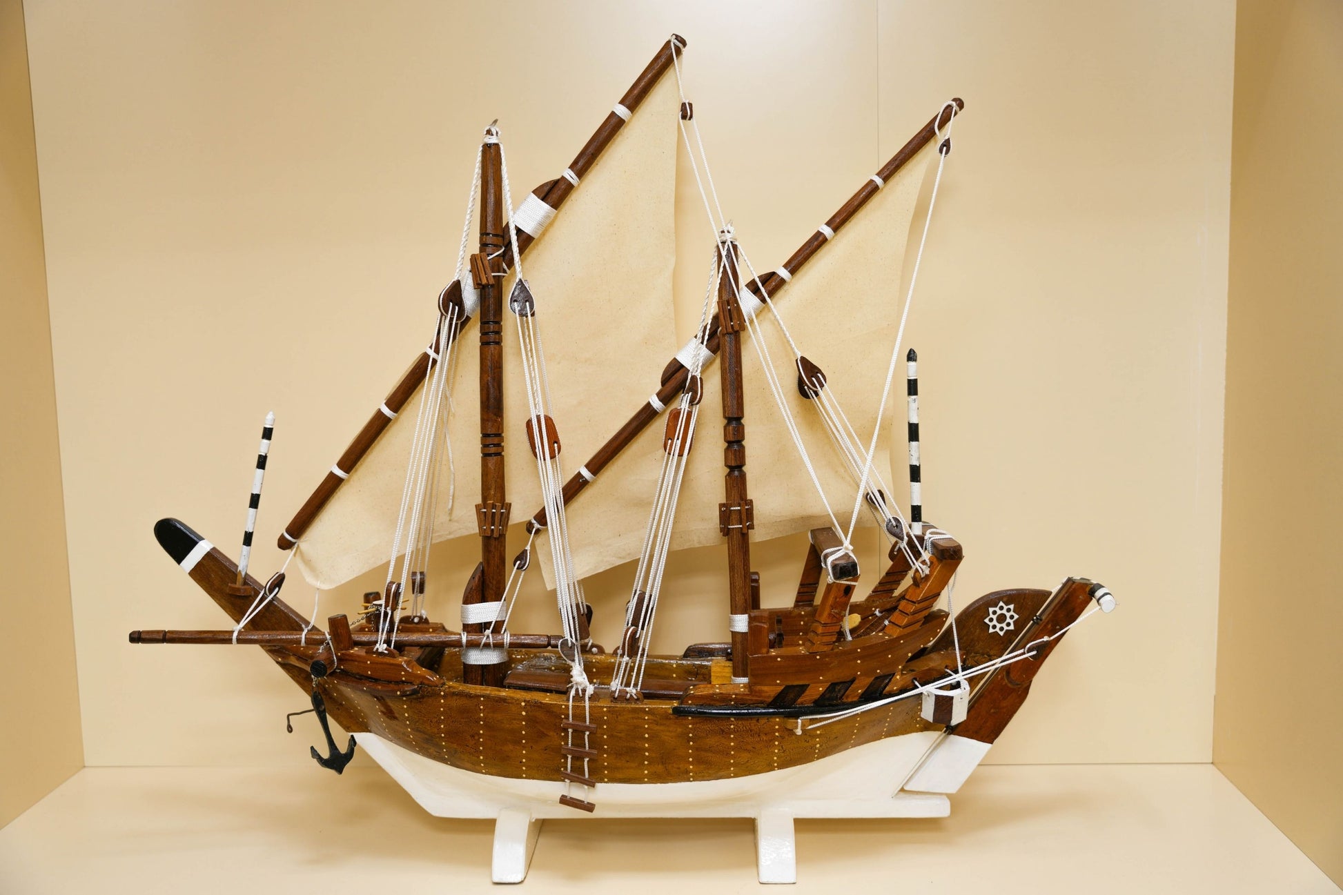 مجسّم بوم تراثي خليجي مصنوع يدويًا من ألياف الزجاج المقاومة وخشب الساج البورمي الفاخر. طول 100 سم وارتفاع 90 سم وعمق 23 سم، بوزن 4.6 كجم. قطعة ديكور فاخرة تُجسّد روح الغوص واللؤلؤ في الخليج، مناسبة للمكاتب والمجالس والهدايا الرسمية.